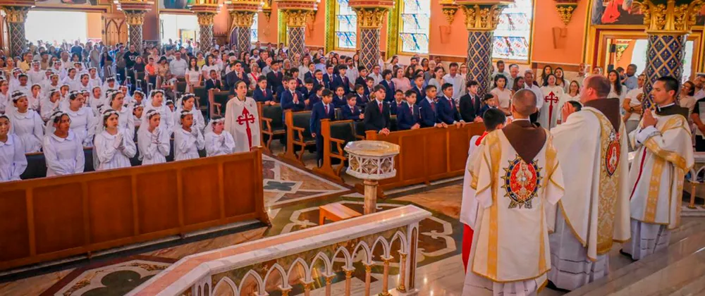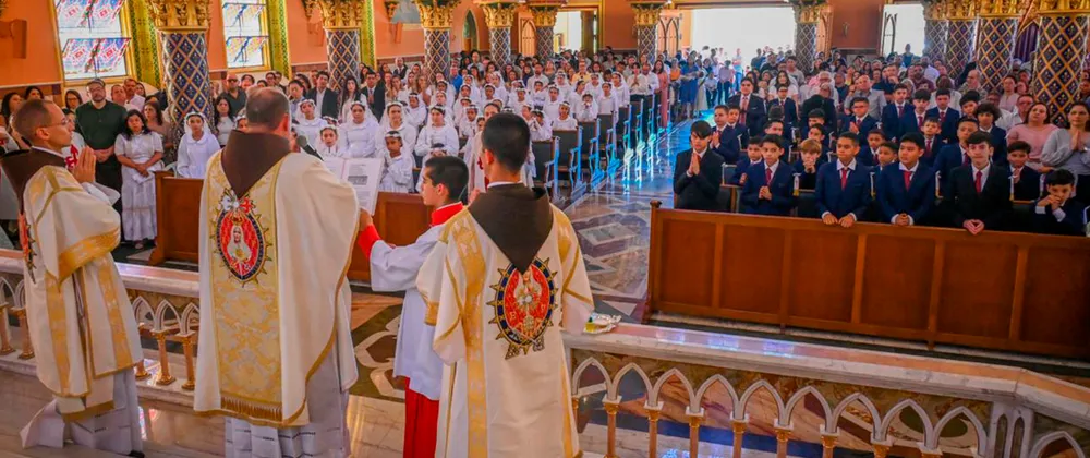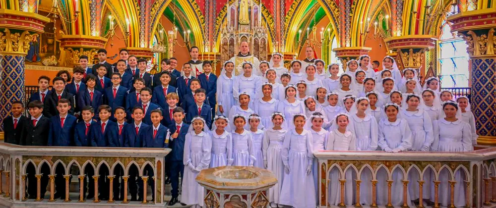 No dia 29 de novembro de 2025, a Basílica Nossa Senhora do Rosário de Fátima, em Cotia, também conhecida como “Contemplação Marial”, esteve ainda mais iluminada, quando 74 crianças receberam a Primeira Eucaristia e 16 foram batizadas, em cerimônia presidida pelo Pe. Celso Bruno, EP.