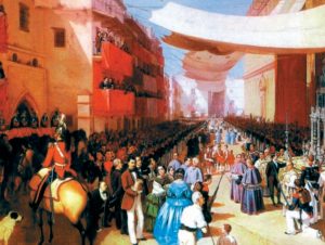 Fanfarras de trompetes anunciam o terceiro cortejo — do Santíssimo Sacramento — atrás do qual seguirá o do Imperador-Rei. Na primeira linha estão escudeiros vestidos de vermelho rutilante; em seguida, militares da corte, com “panache” branco, montados em cavalos cinzas; os dragões e os hussardos. Ainda um esquadrão de cavalaria e eis que surgem os cardeais.