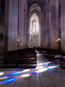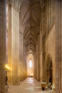 E no seu interior, a par da força expressa nas suas colunas, da bondade acolhedora sob suas ogivas, do recolhimento e respeito que nos tomam debaixo de suas abóbadas, vamos encontrar nas irisações suaves dos seus vitrais, na luz especial que coa por toda a parte, uma resplendente cintilação da calma e do caráter contemplativo do espírito português.