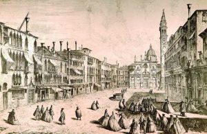 Uma bela gravura do século XVIII1 retrata uma cena quotidiana na Praça Santa Maria Novella, em Veneza. Local de pequenas dimensões, no qual se leva, sem dúvida alguma, uma existência de intimidade. Entre os personagens ali presentes, entre as próprias casas, nota-se uma espécie de fraternidade. Essas moradias parecem irmãs, aconchegadas umas nas outras, assim como as pessoas, envoltas numa certa suavidade, uma certa familiaridade.