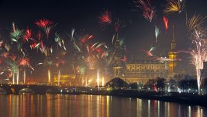 Junto ao majestoso palácio ou sobre as plácidas águas do grande lago, envolvendo praças, silhuetas de imagens ou lindos chafarizes, a noite está em festa, regozija-se, enquanto magníficos fogos de artifício cruzam os ares, iluminando e engalanando o céu, conforme os mais audaciosos desejos do homem.