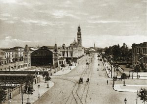 Chegava-se à estação pouco antes do trem partir. E havia certo inebriamento em chegar pouco tempo antes, fazendo que o automóvel corresse bastante. Então, diziam para o chauffeur: “Toca, toca, toca”. Nas ruas quase desertas da São Paulinho, aqueles automóveis com umas buzinas de borracha ligadas a uma espécie de corneta; apertava-se a buzina de borracha: fuóóónnn. Dava a impressão de que o automóvel assoava o nariz naquela hora. Depois a borracha ia se enchendo de novo, e o veículo correndo, os para-lamas muito grandões, mal fixados no corpo do automóvel, fazendo barulho. As ruas não eram asfaltadas, mas com calçamento que provocava muitos solavancos, e solavancos de ferro. Cada vez que o automóvel mudava de velocidade, eu tenho a impressão de que precisava abrir o escapamento e sair barulho; e a família dentro apressada porque podia perder o trem. Mas isto era um atrativo da viagem.