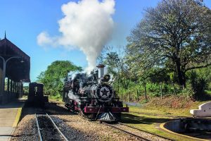 Depois, a chaminé com o silvo que rasgava o silêncio da cidade: fuuuu, fuuuu, fuuuu, a fumaça começava a exalar e o trem saía da estação. Adeuses… – iam se ver dali três ou quatro dias; gente da família ia acompanhar os viajantes à estação, às vezes –: “Olha, não deixe de me escrever, hein!” Essas coisas à última hora, as senhoras lançavam beijinhos, etc. Afinal de contas, o trem estava tão longe que todos se sentavam: Ahhh! Mas então já se encontrava mais ou menos no campo, e outras imagens se sucediam.