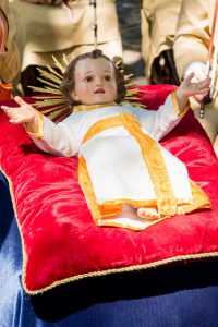 Maria Santíssima, com sua candura e força virginais, traz o Menino bem protegido sobre o seu coração.
