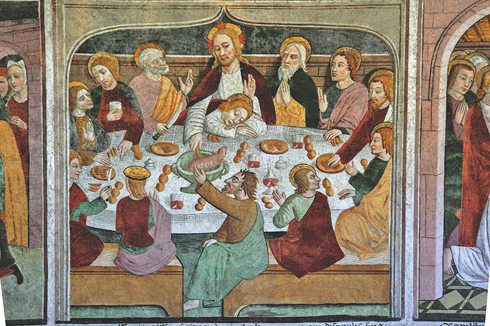 De acordo com o costume do tempo, nos banquetes as mesas eram dispostas em forma de “U” e os comensais não comiam sentados como hoje, mas reclinados em divãs distribuídos no lado externo da mesa.