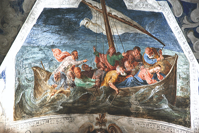 Tendo partido com os Apóstolos ao cair da tarde, de repente, o tempo se fecha, faz-se noite, as águas começam a se agitar, os ventos sopram impetuosos sobre a humilde barca, que ameaça afundar.