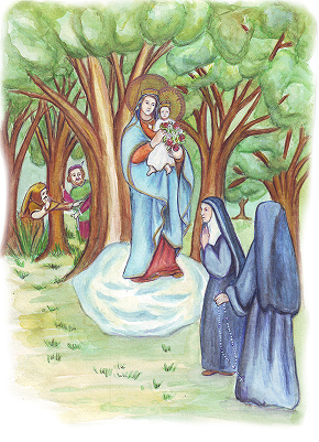 Mas, no momento em que estes se dispunham a assaltá-las, uma visão celestial os deteve: junto às religiosas, uma formosa Senhora, cheia de luz, fazia brotar dos lábios da irmã Maria uma rosa vermelha ou branca por cada Pai-Nosso ou Ave-Maria que ela rezava, e as tomava em suas alvíssimas mãos.