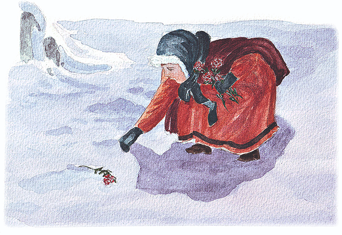 Em sua mão esquerda portava uma cesta de rosas, as quais ia espalhando ao longo do caminho, justamente nas pegadas que a menina deixava sobre a neve.