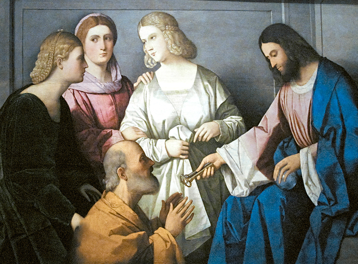 Mt 16, 13Ao chegar à região de Cesareia de Filipe, Jesus fez a seguinte pergunta aos seus discípulos: “Quem dizem os homens que é o Filho do Homem?” 14Eles responderam: “Uns dizem que é João Batista; outros, que é Elias; e outros, que é Jeremias ou algum dos profetas”. 15Perguntou-lhes de novo: “E vós, quem dizeis que Eu sou?” 16Tomando a palavra, Simão Pedro respondeu: “Tu és o Messias, o Filho de Deus vivo”. 17Jesus disse-lhe em resposta: “És feliz, Simão, filho de Jonas, porque não foi a carne nem o sangue que to revelou, mas o meu Pai que está no Céu. 18Também Eu te digo: tu és Pedro e sobre esta Pedra edificarei a minha Igreja, e as portas do inferno nada poderão contra ela. 19Dar-te-ei as chaves do Reino do Céu; tudo o que ligares na Terra ficará ligado no Céu e tudo o que desligares na Terra será desligado no Céu”.