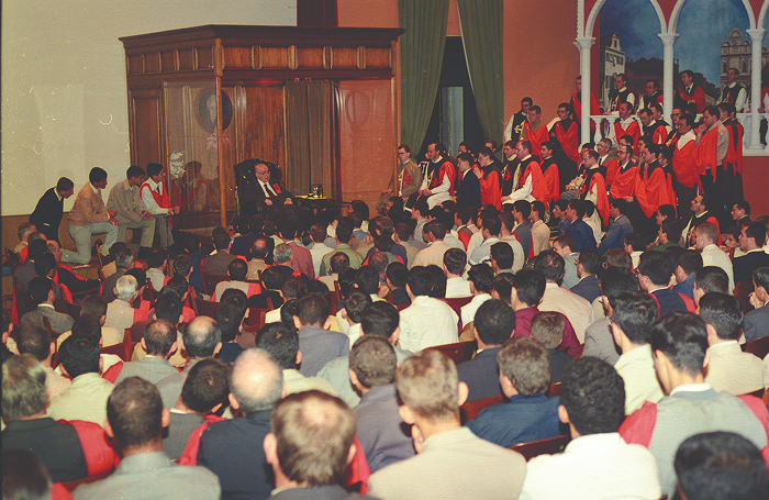 Fazia, por exemplo, abençoadas palavrinhas, nas quais grupos de rapazes – fossem estudantes antes de partirem para suas aulas ou juveníssimos discípulos vindos de outras regiões do Brasil e do exterior – expunham com total confiança suas dificuldades para vencer as batalhas da virtude em idade tão delicada, suas incipientes inquietudes doutrinárias ou sua curiosidade a respeito da história daquele pai que os acolhia com tanta afabilidade. Dr. Plinio atendia a todos e costumava concluir o encontro cumprimentando pessoalmente a cada um, momento inesquecível em que não faltavam trocas de palavras e conselhos rápidos, mas profundíssimos, pois iluminados pelo carisma de discernimento dos espíritos com que ele fora ornado pela Providência.