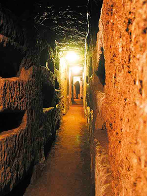 É-nos fácil imaginar as sombras furtivas daqueles fervorosos cristãos se esgueirando, ao cair da noite, pela entrada da catacumba, constituída apenas por um orifício no chão.