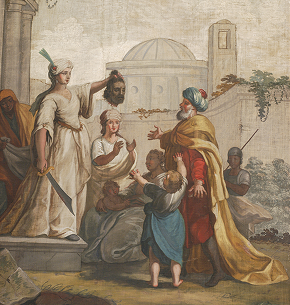Tomou então a espada que estava à cabeceira do leito e, após rezar interiormente para que o Deus de Israel lhe desse forças, desferiu dois golpes na nuca do general, arrancando-lhe a cabeça.
