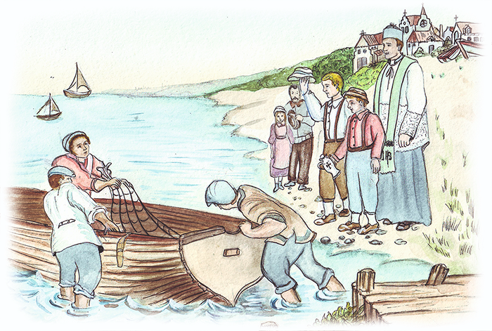 Acercando-se, o sacerdote os saudou. Eles passaram a contar como os pescadores da aldeia estavam confundidos com a situação... Até o próprio pai!