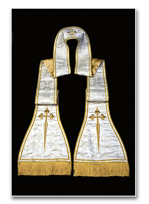 Em seguida, reveste-se da estola, uma faixa do mesmo tecido e da mesma cor da casula, adornada de três cruzes: uma no meio e as outras duas nas extremidades. Ela simboliza a autoridade espiritual do sacerdote e, de outro lado, o jugo do Senhor, que ele deve levar com coragem, e pelo qual há de recuperar a imortalidade. O padre a coloca em torno do pescoço, depois a cruza sobre o peito e passa por baixo do cíngulo, enquanto reza: “Restaurai em mim, Senhor, a estola da imortalidade, que perdi pela desobediência de meus primeiros pais, e, indigno como sou de aproximar-me de vossos sagrados mistérios, possa eu alcançar o gozo eterno”.