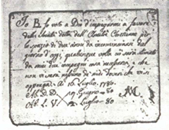 Terminado o tempo de avaliação, caso fosse achado digno ele deveria fazer três votos: de não ler por um ano nenhum livro proibido; de consagrar uma hora por semana a uma atenta leitura de um livro de formação religiosa subministrado pela associação; de obedecer aos superiores naquilo que tocava à boa ordem e à atividade comum da Amicizia.2