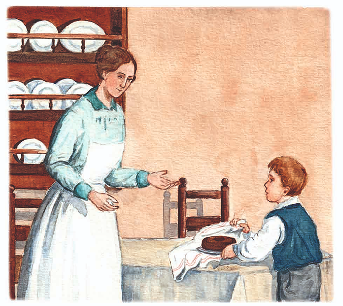 Por volta da uma e meia da tarde, Da. Amélia costumava interromper seus trabalhos para esperar Pedrinho chegar do colégio, levado por um caridoso senhor que morava pela região e trabalhava na escola.