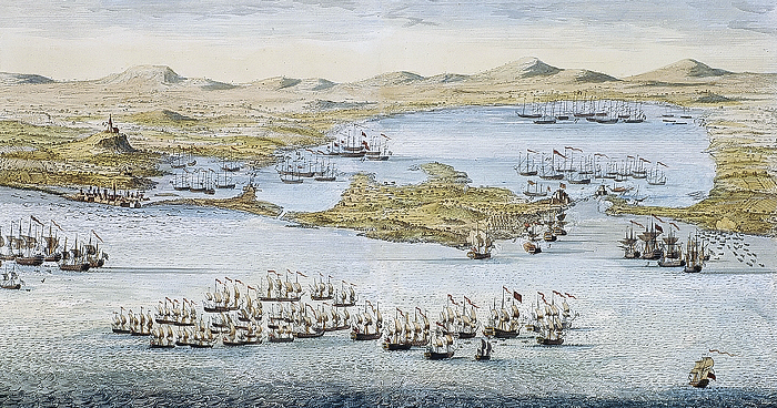 De um lado, ingleses e holandeses, uma formidável frota “composta por sessenta navios de linha, várias fragatas, com um total de três mil e seiscentos canhões e quase vinte e três mil homens”.[1]