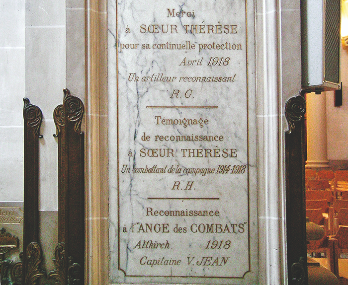 O mosteiro carmelitano de Lisieux, onde ela fez o holocausto de sua vida ao amor misericordioso de Deus, possui mais de dois mil dossiês contendo cartas autógrafas recebidas no decorrer do conflito, bem como condecorações, medalhas, balas, capacetes e obuses transformados em ex-votos.