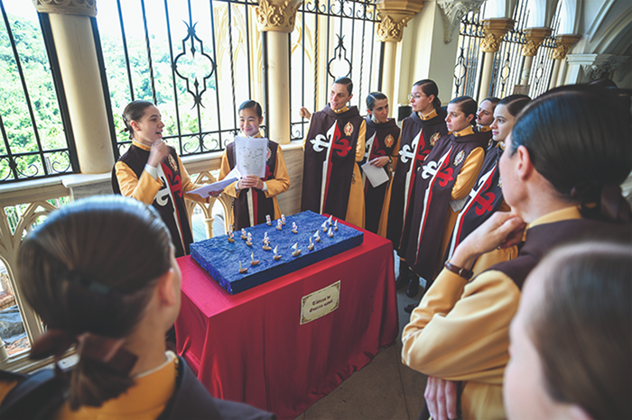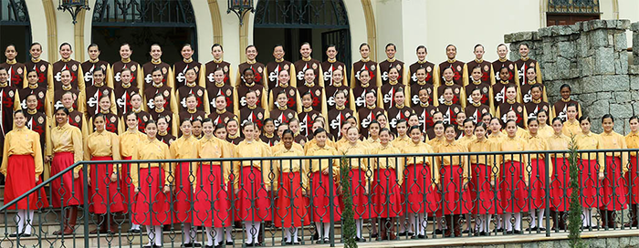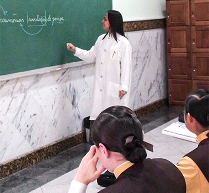 Às oito horas e vinte minutos em ponto, as alunas põem fim às conversas para, reunidas no pátio, cantarem o Credo e se dirigirem em cortejo para as salas de aula enquanto ressoam os instrumentos e são ouvidos cânticos entoados por vozes juvenis.