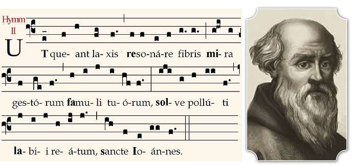 Outra inovação introduzida por ele se refere à nomenclatura das notas, que até aquele momento eram identificadas segundo o método alfabético grego: A (lá), B (si), C (dó), D (ré), E (mi), F (fá) e G (sol). Baseando-se num hino a São João Batista em que cada inciso começa num grau da escala musical, Guido deu o nome às notas tal qual as conhecemos hoje.