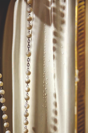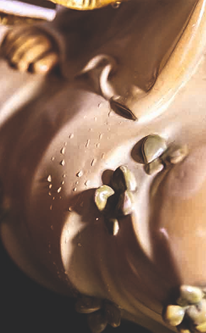 Algumas delas se mostraram tão copiosas que as lágrimas caíram sobre o Coração, as mãos e a pequena esfera dourada que se encontra à altura da cintura, e outras deslizaram pelo vestido até atingir os pés e a nuvem que serve de base.