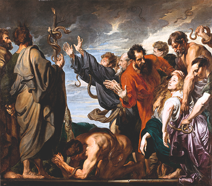 Na corte é pedido a Moisés que realize algum portento, e Aarão joga sua vara, que se transforma em serpente. Os magos do Egito, por ordem do faraó, fazem o mesmo com seus feitiços, mas o cajado de Moisés devora todos os outros. Porém, o coração do chefe da nação egípcia permaneceu endurecido.