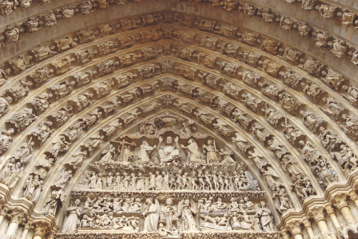 Bem acima da porta central, Cristo sentado em seu trono fita com olhar severo a humanidade que desfila diante d’Ele, numa vivíssima representação do Juízo Final. São cenas grandiosas, cuja contemplação nos estarrece e nos leva a medir nossa própria pequenez.