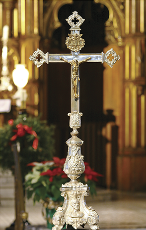 A presença desse ornamento durante a celebração da Missa provavelmente teve sua origem nas cruzes que precediam as procissões estacionais, cuja haste podia ser retirada, permitindo depositá-las em pé sobre o altar.