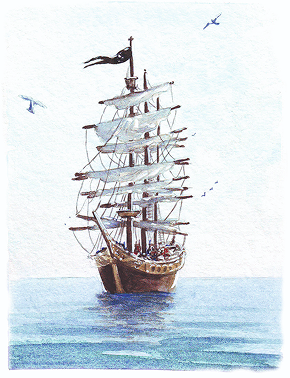 O imponente navio avançava com as velas enfunadas, destacando-se no límpido horizonte daquela tarde de verão, enquanto se aproximava rapidamente da costa da ilha. No alto do mastro tremulava a temível bandeira negra. Não cabia dúvida: os piratas iam desembarcar!