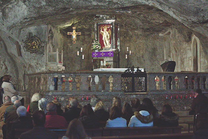 Este último, não se sentindo digno de ingressar na gruta, recolheu-se em oração à entrada do recinto, osculou o chão e gravou numa das pedras o sinal do tau.