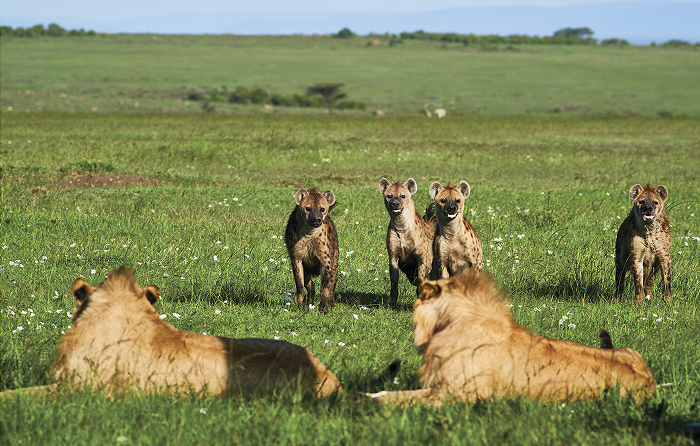 Ao longe, é possível ver uma alcateia se aproximando. Em geral as hienas se alimentam preguiçosamente das carcaças deixadas por outros predadores, mas, em conjunto, chegam a arriscar um ataque temerário ao rei dos animais.