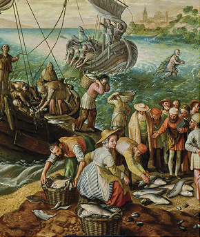 Ao comentar estes versículos, São Tomás ressalta a eclesialidade da doutrina evangélica enquanto participação comum em grandes bens. O mar representa o mundo, e as redes a Igreja, na qual se reúnem peixes de variados tamanhos e espécies.