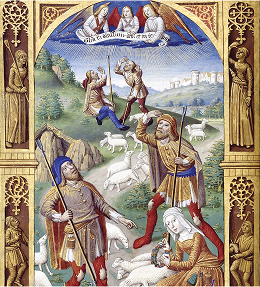 Os pastores, que relembravam a retidão antiga, vendo aparecer os Anjos cantando e anunciando-lhes a primeira notícia – “Glória a Deus no mais alto dos Céus e paz na terra aos homens de boa vontade” (Lc 2, 14 Vulg.) – encantaram-se e foram em direção ao Presépio, levando seus presentinhos ao Menino Jesus.