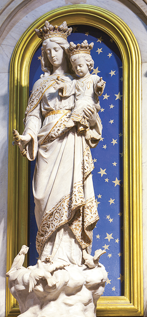Era uma linda imagem de Nossa Senhora Auxiliadora, de mármore absolutamente branco, tão alva que parecia feita de neve. Radiosa, com coroa de Rainha na cabeça, tendo o Menino Jesus no braço esquerdo e um cetro na mão direita.
