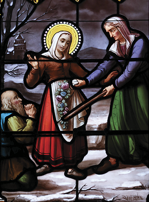 Percebendo o volume que a jovenzinha carregava, a madrasta correu furiosa atrás dela e abriu-lhe à força o tecido, fazendo cair ao solo inúmeras flores…