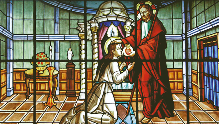 Com muita doçura e um suave sorriso, Nosso Senhor Jesus Cristo “tirou da cavidade do peito o seu Coração”,9 aproximou-o dos lábios da Santa e o deu a beijar, dizendo-lhe: “Jamais concedi igual graça a uma alma”.10