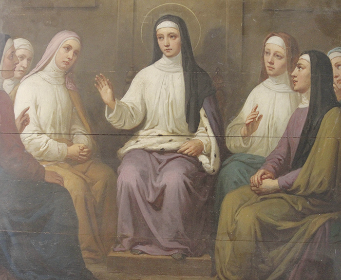 Em seguida, desejando estar a sós com Deus, pediu-lhes que fossem à capela próxima cantar os Salmos. Quando mais tarde retornaram, constataram haver a santa abadessa abandonado esta terra.