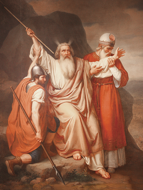 De quando em vez, Josué devia olhar para o alto da colina. Advinha-lhe então um consolo: Moisés estava lá, em pé, rezando por ele. Entretanto, a presença dos dois auxiliares que o seguravam indicava uma dura realidade: o profeta podia cansar-se e, portanto, era homem.