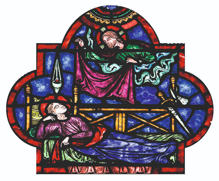Nessa noite, o jovem soldado viu em sonhos Cristo Jesus vestido com a metade do agasalho por ele doado. E ouviu-O dizer com voz forte a uma multidão de anjos: “Martinho, que é apenas catecúmeno, cobriu-Me com este manto”.1