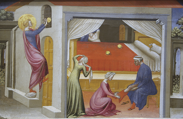 O primeiro aconteceu quando o Santo Bispo soube que o pai de três moças estava em sérios apuros financeiros e não conseguiria pagar o dote necessário para o casamento das filhas, o que as levaria a adotar uma vida errante…