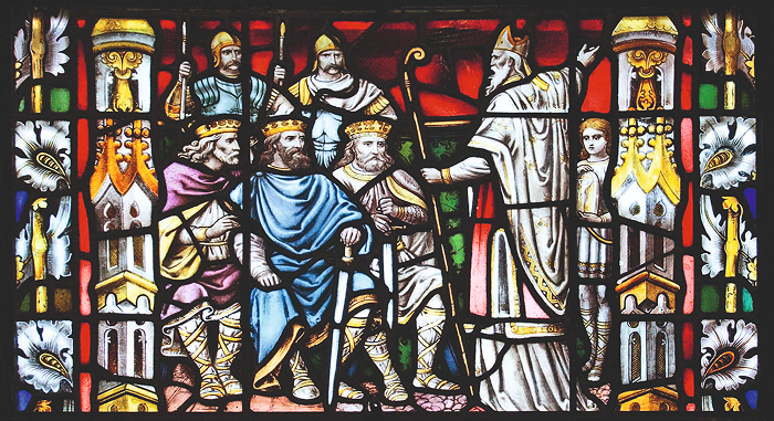 Bem conhecia este chefe pagão a previsão dos antigos poetas celtas, segundo a qual um personagem paramentado e portando um báculo chegaria à ilha e reduziria a cacos o império dos druidas.