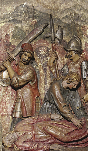 Mas, tendo este errado o primeiro golpe, ela caiu ao chão e, nos estertores da morte, seu vestido se descompôs. Alódia correu para junto da irmã para ajeitar-lhe as roupas.