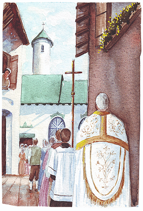 Após um breve ato de adoração, o pároco tomou as Sagradas Partículas, cobriu-as com um véu e conduziu-as até a igreja, onde já bimbalhavam os sinos.