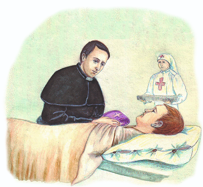 O sacerdote acorreu ao chamado com diligência e chegou junto ao leito do ferido.