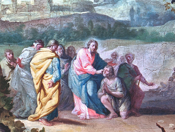 Os homens pedem a Nosso Senhor que imponha a mão sobre seu companheiro porque naquele tempo os sacerdotes utilizavam esse gesto a fim de implorar a cura para os doentes. Jesus, porém, não usará esse sistema habitual.