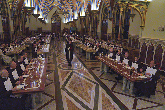 Para onde se dirige tão majestoso cortejo? Ele se desloca da capela para o refeitório, onde, depois de terem sido alimentadas a almas, vão ser nutridos os corpos. É algo que todo ser humano precisa fazer cotidianamente…