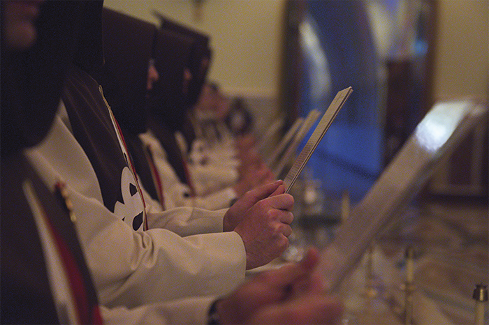 O sino anuncia ter chegado o momento da bênção do Santíssimo Sacramento. Silenciosamente, os religiosos vão se dispondo nos bancos da capela prontos para receber as graças próprias a este ato litúrgico.