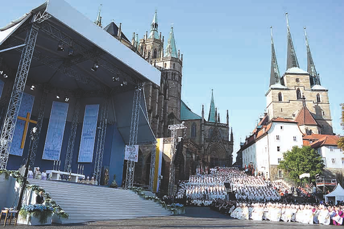 Nas fotos: início das Vésperas Marianas em Etzelsbach, chegada para a Missa no Estádio Olímpico de Berlim, Celebração Eucarística na Domplatz de Erfurt e Missa no Aeroporto de Friburgo.