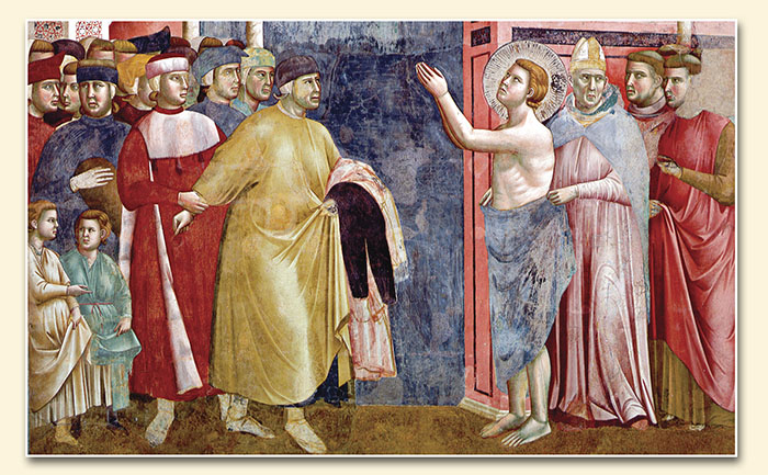 Para o ganancioso pai, Pedro Bernardone, que se queixava ao Bispo da excessiva generosidade das esmolas do filho, Francisco entrega até suas ricas vestimentas, passando a usar apenas uma pobre túnica.